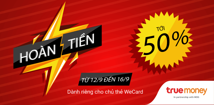 Duy nhất từ 12-16/9/2018, khi giao dịch với thẻ ảo WeCard MasterCard với giá trị thanh toán từ 200,000đ trở lên, bạn sẽ được hoàn ngay đến 50% (tối đa 100,000đ) vào ví TrueMoney.