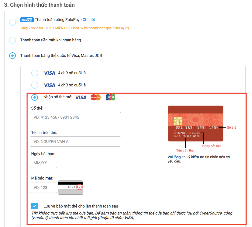 Trong phần “Chọn hình thức thanh toán”, chọn “Thanh toán bằng thẻ quốc tế Visa, Master, JCB”