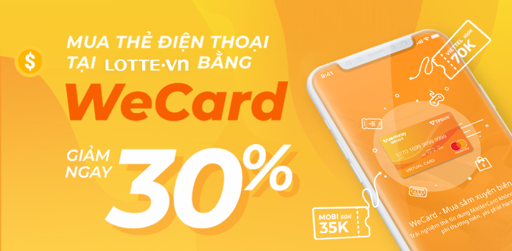 Từ ngày 31/08 đến 30/09/2018, khi sử dụng thẻ WeCard để mua thẻ điện thoại trên website LOTTE.vn, bạn sẽ được chiết khấu lên đến 30%.