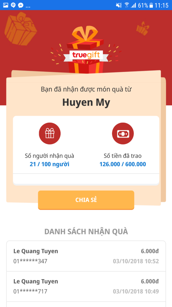 Bước 4: Bạn đã nhận lì xì TrueGift thành công.