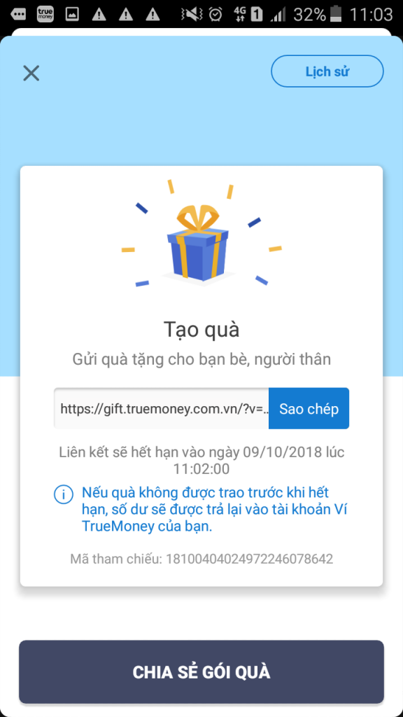 Bước 5: Link nhận lì xì TrueGift đã được tạo. Bạn có thể copy link này để gửi lì xì tới bạn bè, hoặc click vào Chia sẻ gói quà để tặng lì xì thông qua ứng dụng di động.